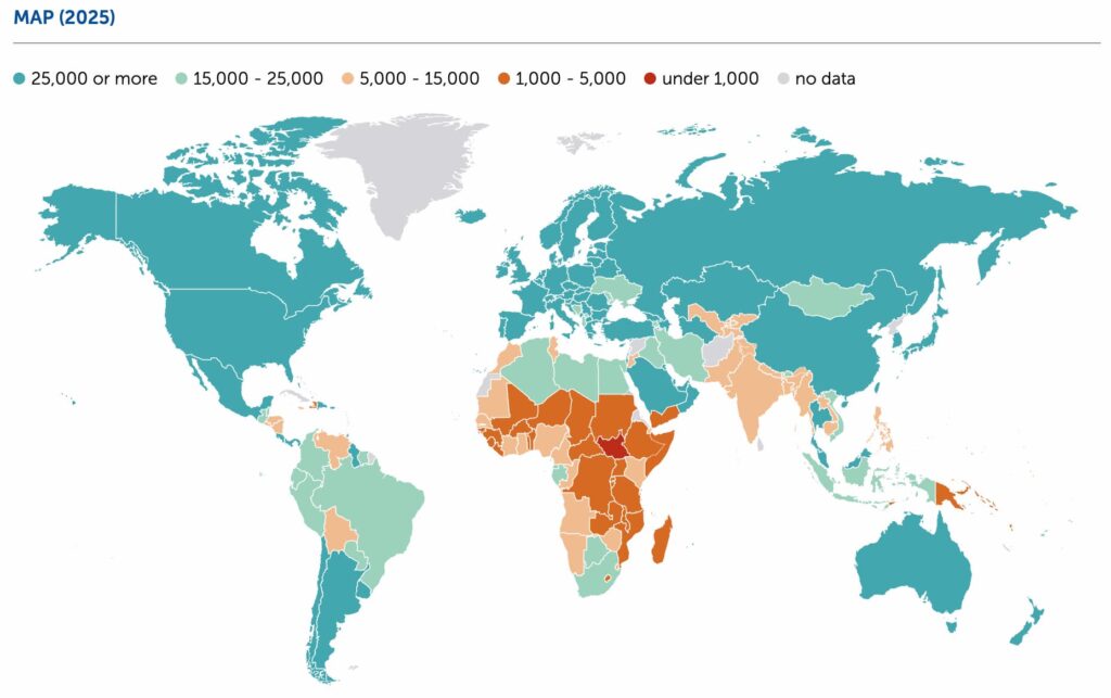 We see GDP per capita at PPP as a key measure because it factors in both population size and actual living costs. For example, two countries might have the same nominal GDP per capita but very different price levels, which means people in each country would spend that income in different ways.